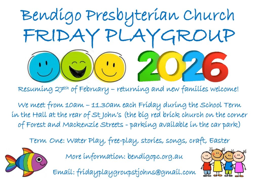 Friday Playgroup is for parents, carers and their babies, toddlers and pre-school children and meets in our Hall from 10am-11.30am (weekly, except for school holidays), commencing on the last Friday of February.
